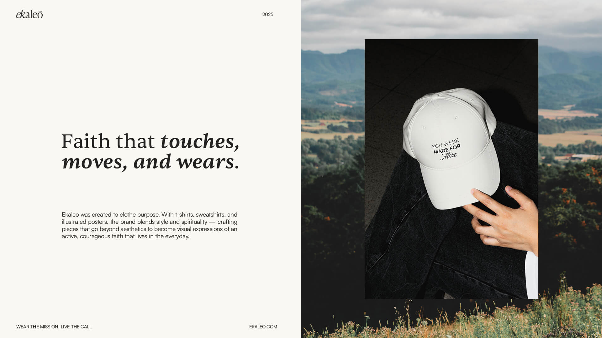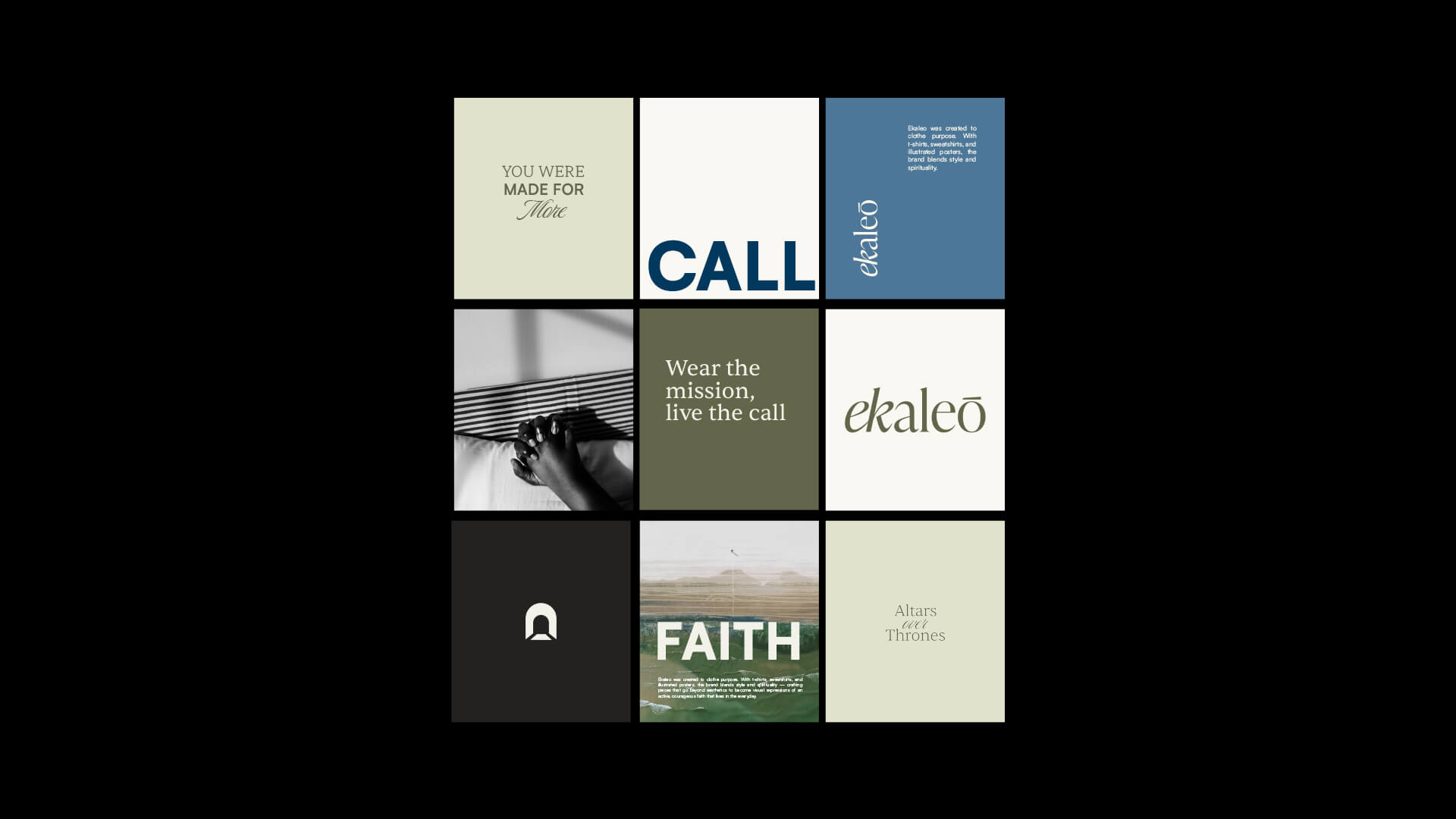 Ekaleo is a Christian clothing brand created to inspire people to live their faith with courage, purpose, and truth. The name comes from the Greek ekkaléō, meaning “to call out” — a concept that shapes the entire identity.The visual system combines expressive typography, a timeless and organic palette, and symbolic elements such as the doorway (a symbol of calling), light, sky, and textures that evoke presence, disruption, and movement.